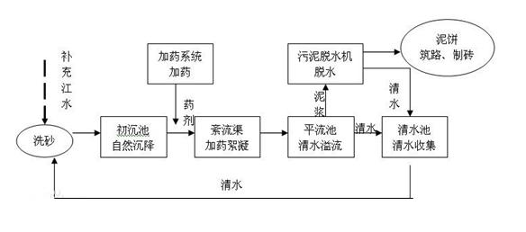 洗砂废水的处理就是进行泥水分离,通过物理的方法将泥砂分离出来,由于洗砂废水含泥沙量较大,先用初沉池自然沉降的办法将细沙沉淀下来,进而控制进入加药絮凝环节的含固量,以达到降低药剂成本投资的目的,然后通过添加絮凝剂,形成颗粒沉淀,上清液进入清水池回用,下层淤泥进入污泥脱水设备,泥饼外运处置。工艺流程图如下图所示: